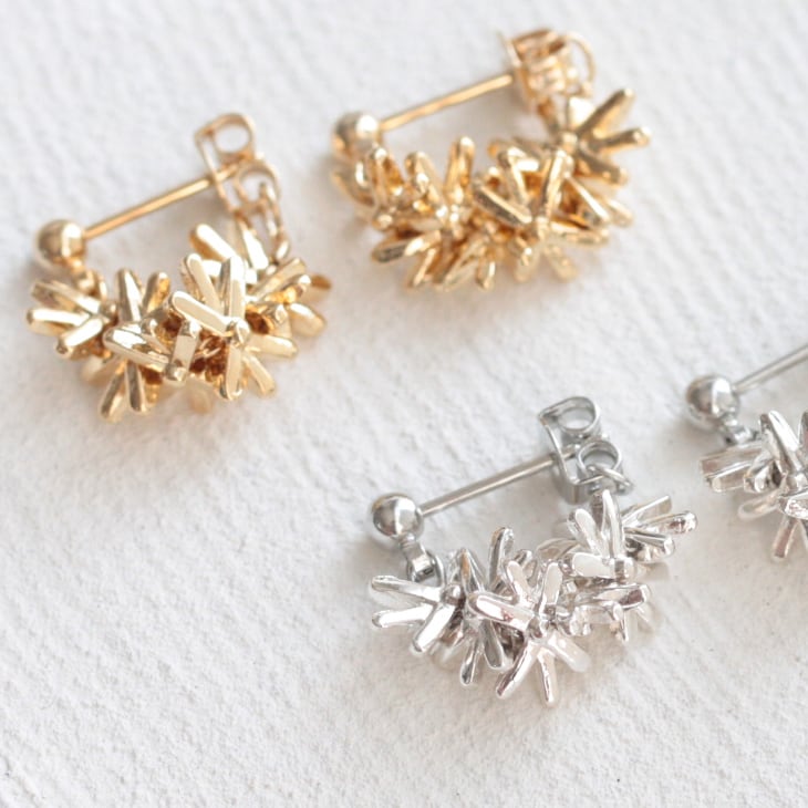 Ferrier ゆらゆらと揺れる光は美しさを閉じ込めた繭玉のよう。 幾重にも織り込まれた繊維感のある加工を施し、動きに合わせて繊細に光り輝くモチーフを作り上げました。 柔らかみのあるフォルムと存在感のある輝きは見るものを魅了する美しさ。 軽いつけ心地で、耳への負担も少なく、スタイリングを楽しめます。 ピアスフックは純チタン製。 金属アレルギーの方も安心してお使いいただけます。 【ご注意ください】 当店商品は1つ1つ手作業で制作している為、形に若干の差が出てしまう場合がございます。 ピアスでも左右の色や形等、全く同じに製作することができません。 膨らみや凹み、色、表面感、小傷に見えるもの、接続部の凸凹、歪み等ある場合がございますが不良品ではございません。 手作り製品の特性として、予めご了承いただけますようお願いいたします。 金属アレルギー対応ピアス専門店 ■SPEC ピアス金具:純チタンフック 重さ:片側約1.6g サイズ:モチーフ縦約1.5cm×幅約1.1cm、全長約3.1cm 規格:純チタン、ブラス ■ピアス金具ガイド(必ずご確認ください) https://sache.base.ec/blog/2023/10/12/134827 ■ラッピングはこちら https://sache.base.ec/categories/548137