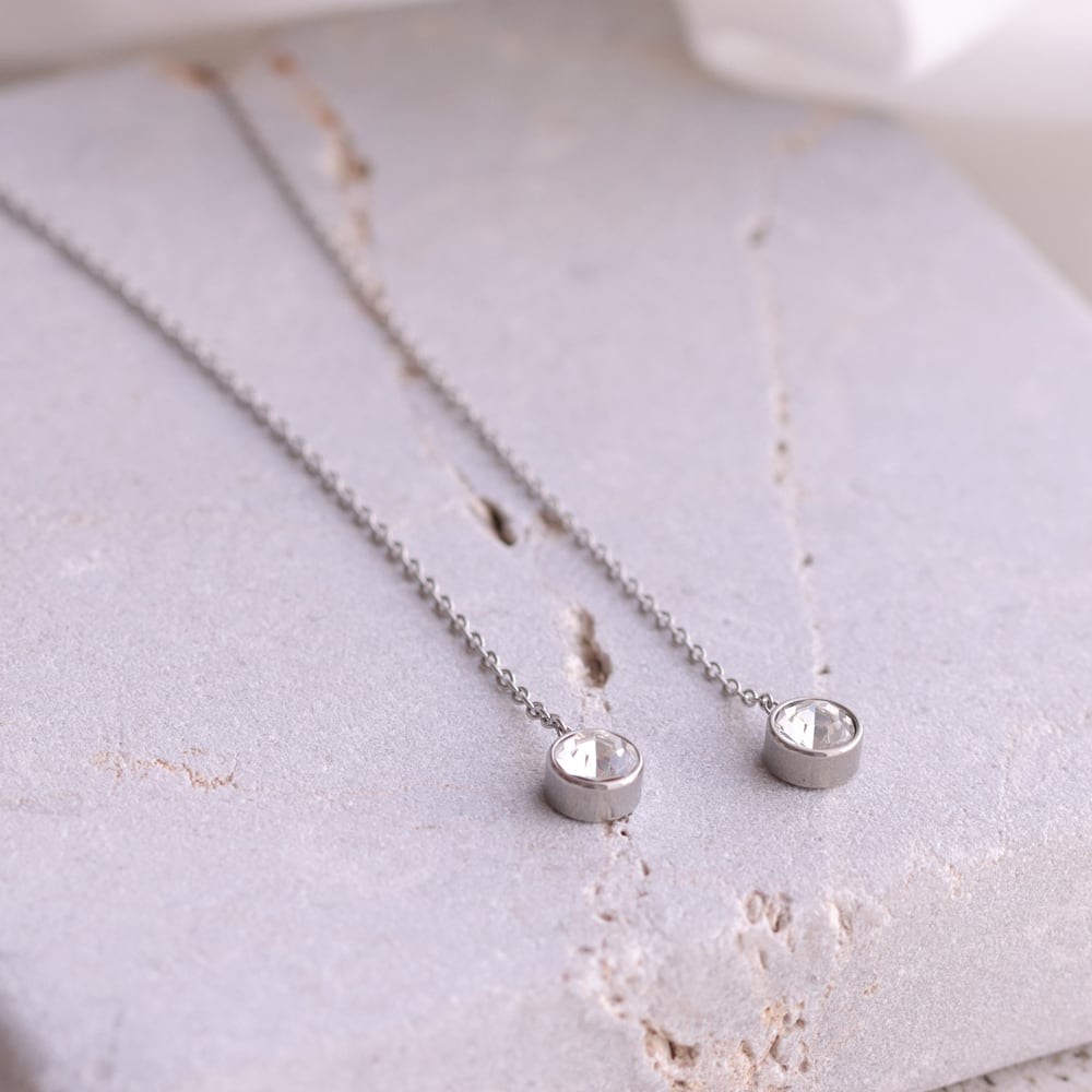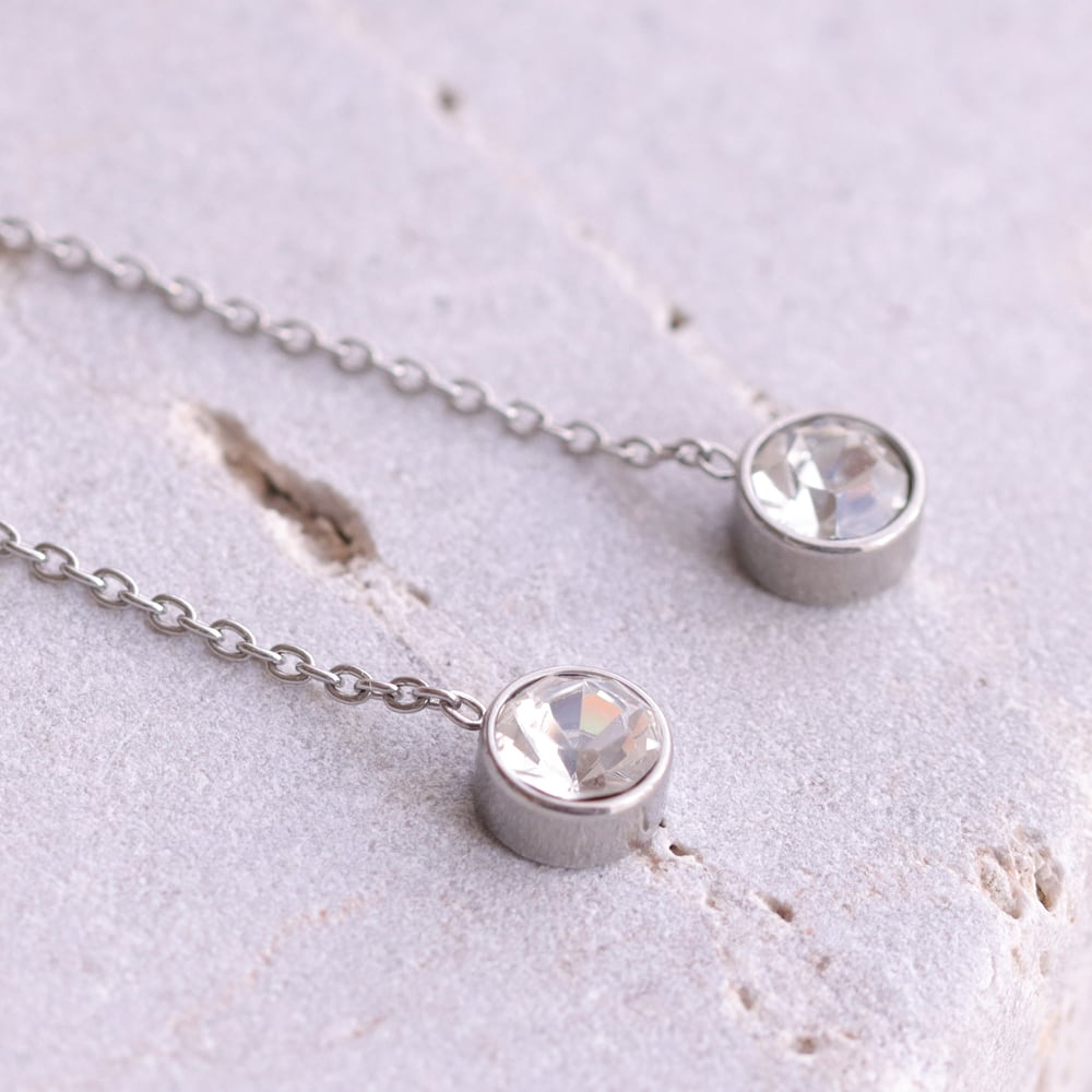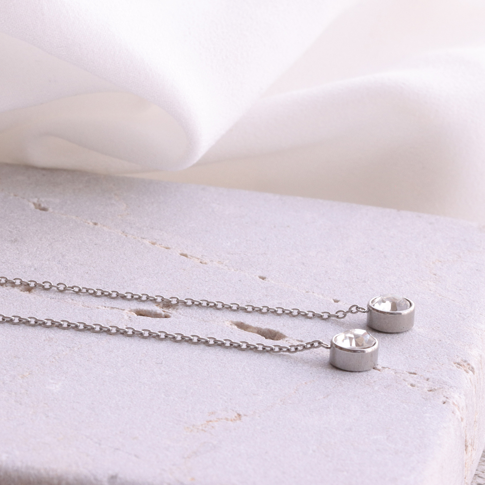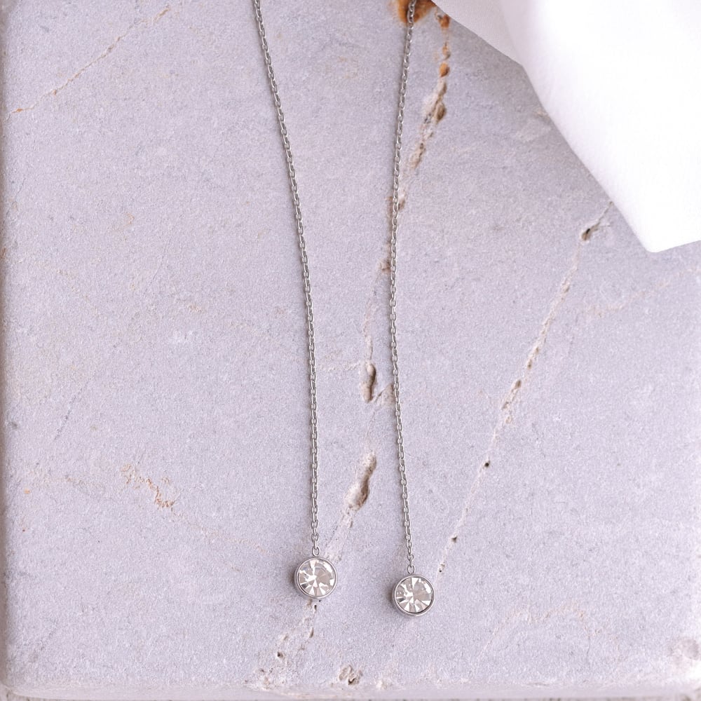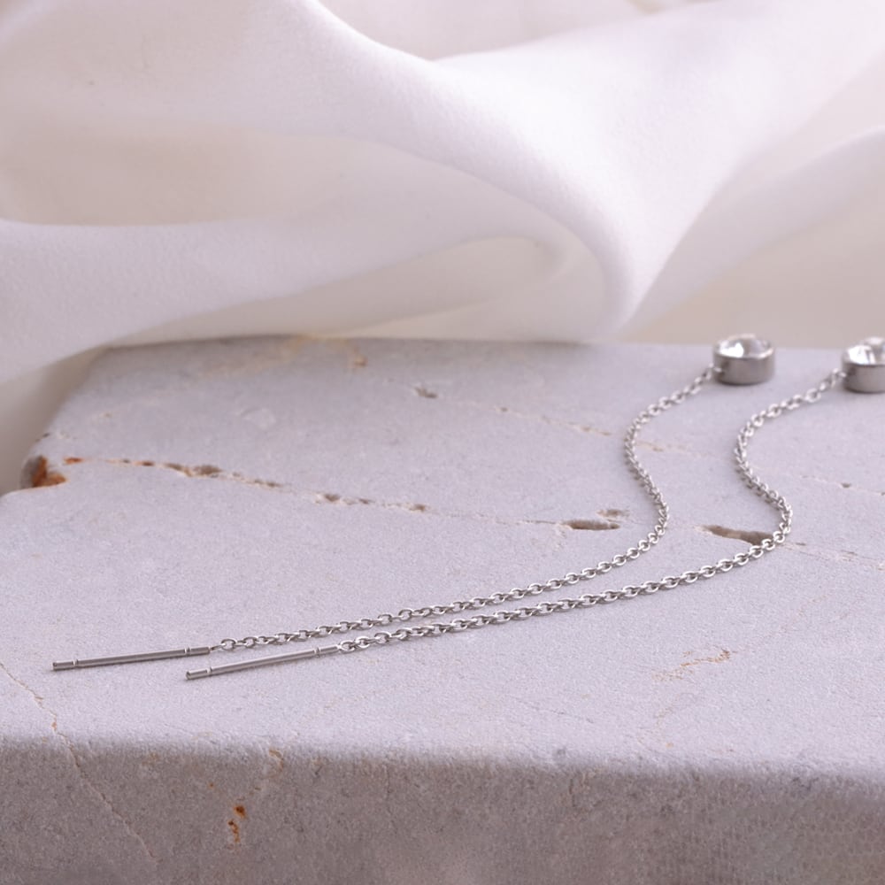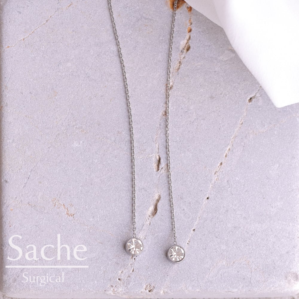 先端にあしらった一粒石のクリスタルは、主張しすぎないサイズ感ながら、透明感のある輝きで存在感をプラス。チェーンの縦ラインと組み合わさることで、顔まわりをシャープに見せ、シンプルな装いにも自然に映えます。
