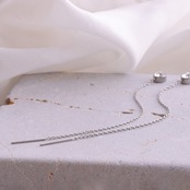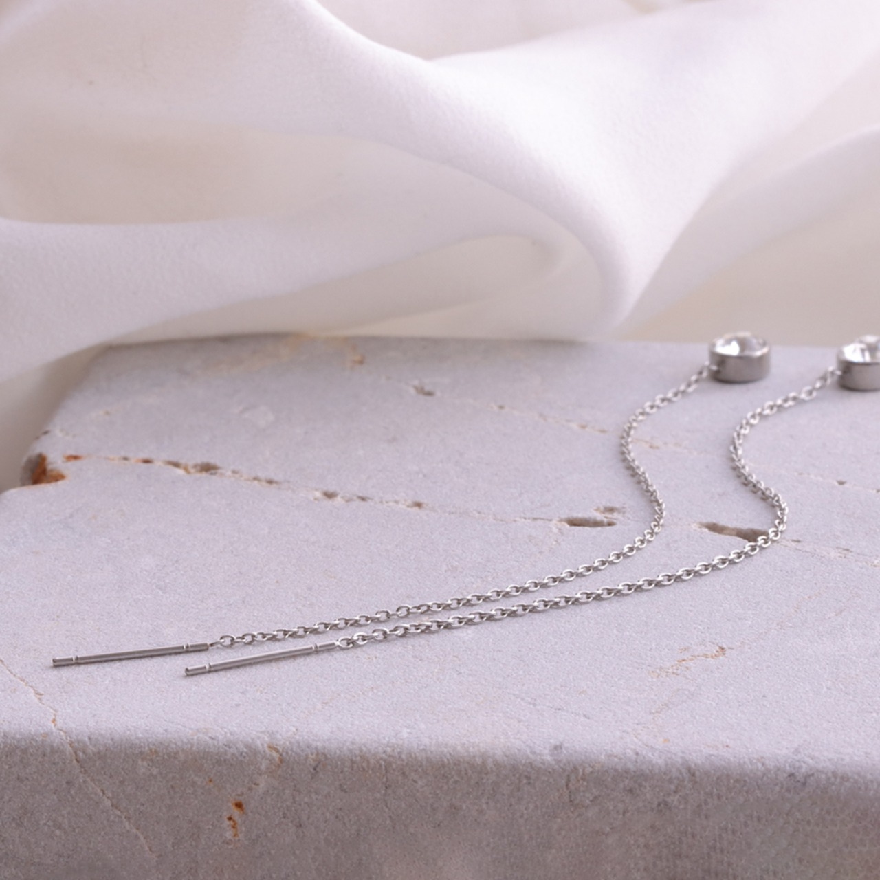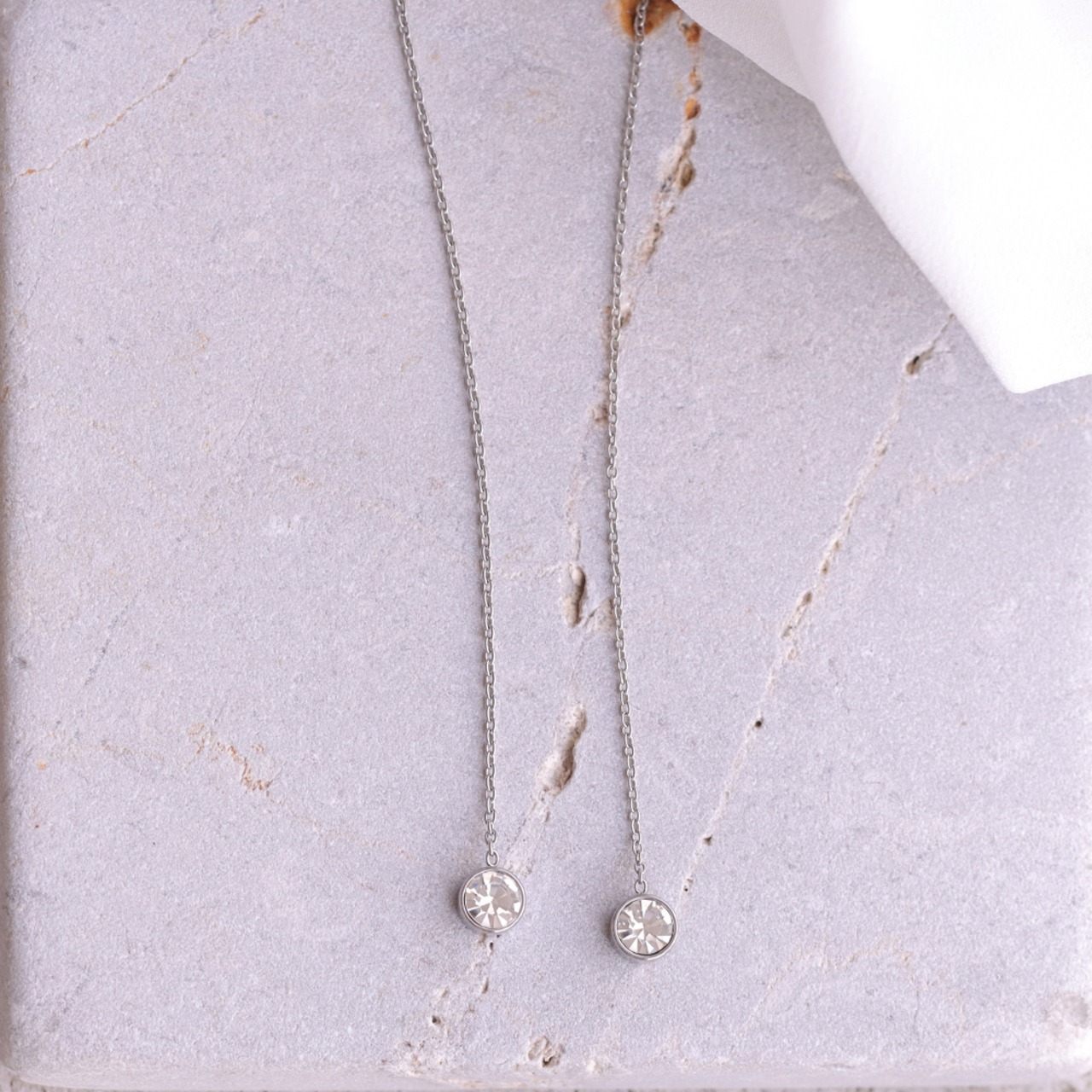 繊細に揺れるチェーンと、先端で静かに輝く一粒のクリスタル。 Stienは、動きに合わせて表情を変えながら、横顔に洗練された余韻を残します。主張しすぎないデザインだからこそ、日常にも特別な日にも自然に寄り添う存在。