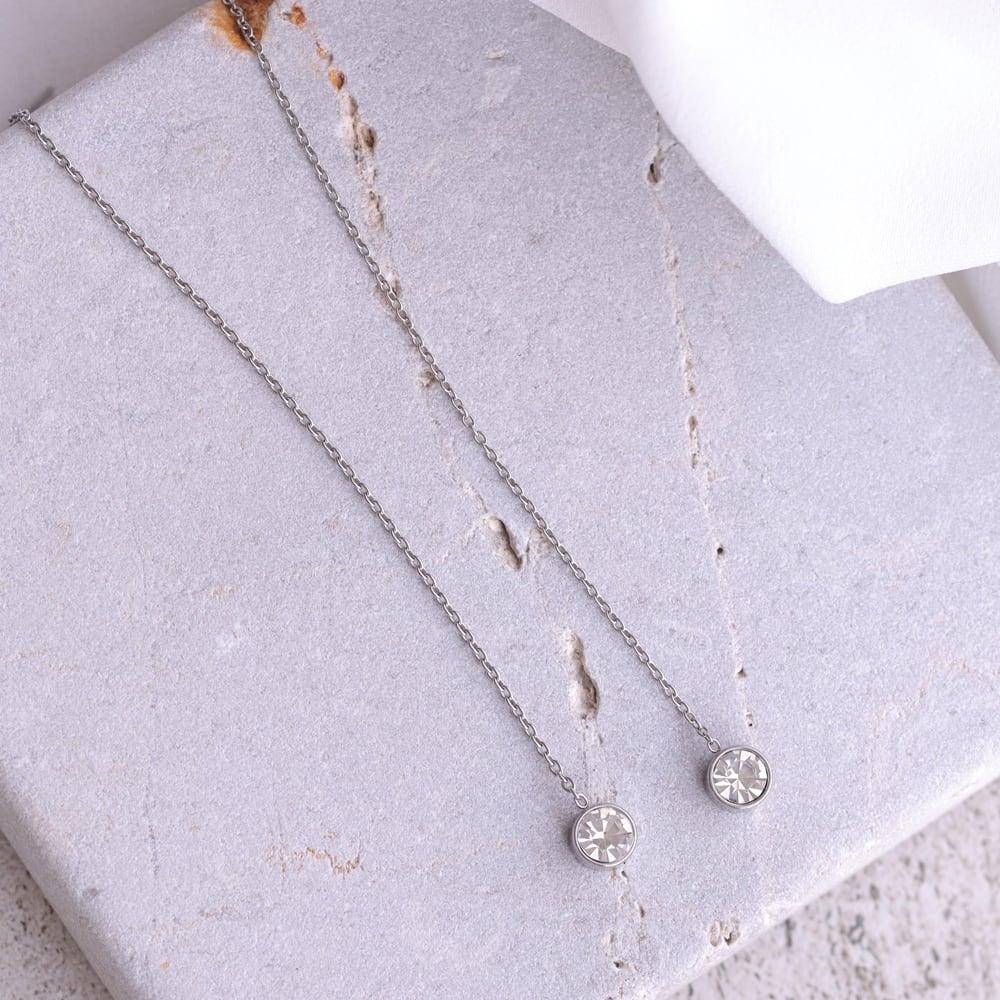 チェーン部分からクリスタルのフレームまで、すべてサージカルステンレスを使用。あえて厚みのあるメタルフレームでクリスタルを包み込み、シャープでモード感のある表情に仕上げました。