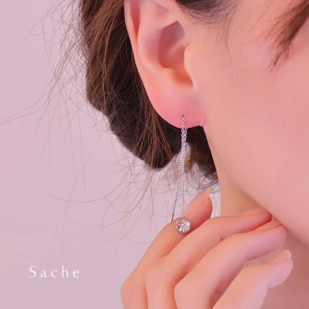 繊細なチェーンの先に、ひと粒のクリスタルが静かにきらめくアメリカンピアス Stien(スティーン)。耳に通して着用するスルータイプならではの軽やかな揺れ感が、動くたびに光を受け、横顔をすっきりと美しく引き立てます。