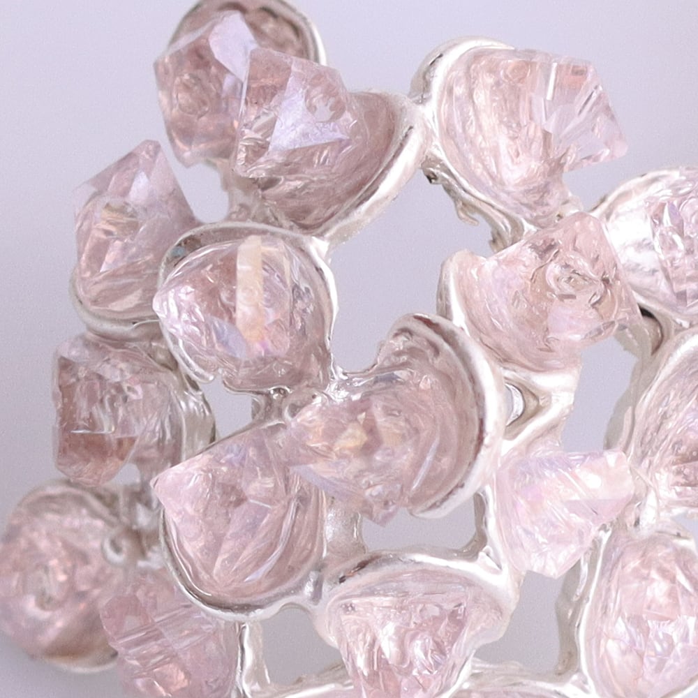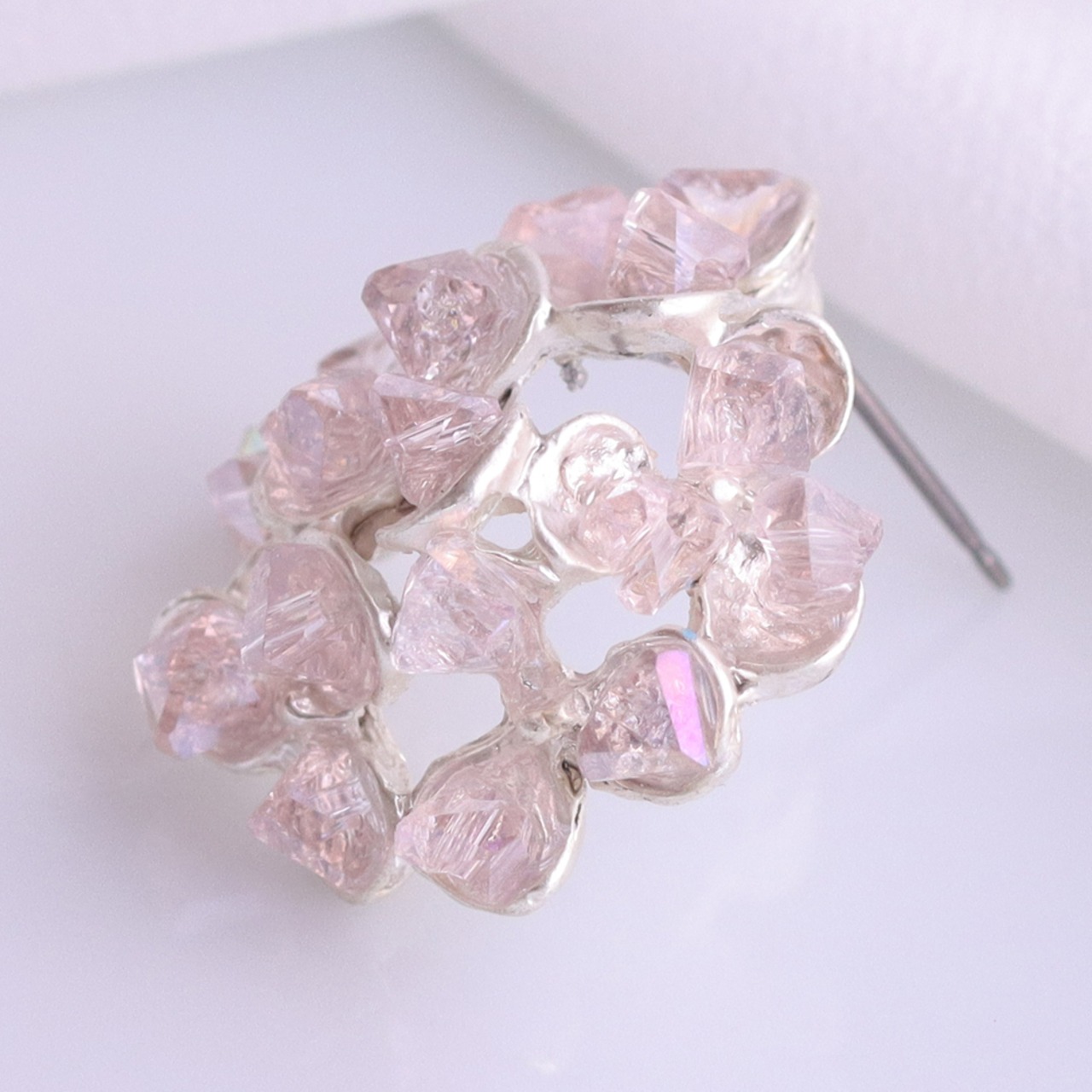 淡く透き通るピンクのきらめきは、ランダムカットのガラスならでは。ひと粒ごとに異なる面が光を受け、やわらかな反射と奥行きを生み出します。均一すぎない表情が、全体に軽やかな華やぎを添えるポイントです。