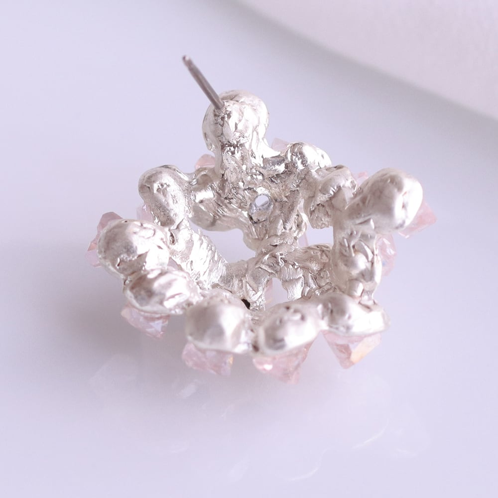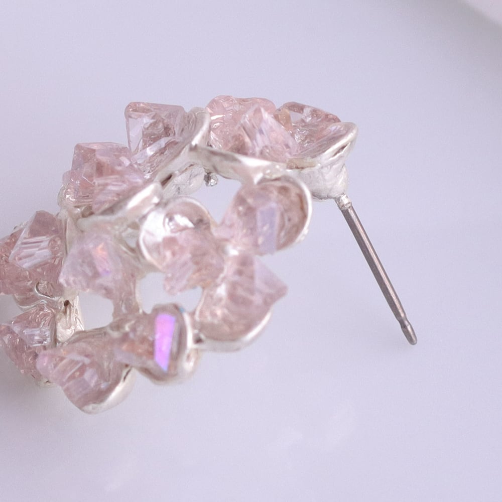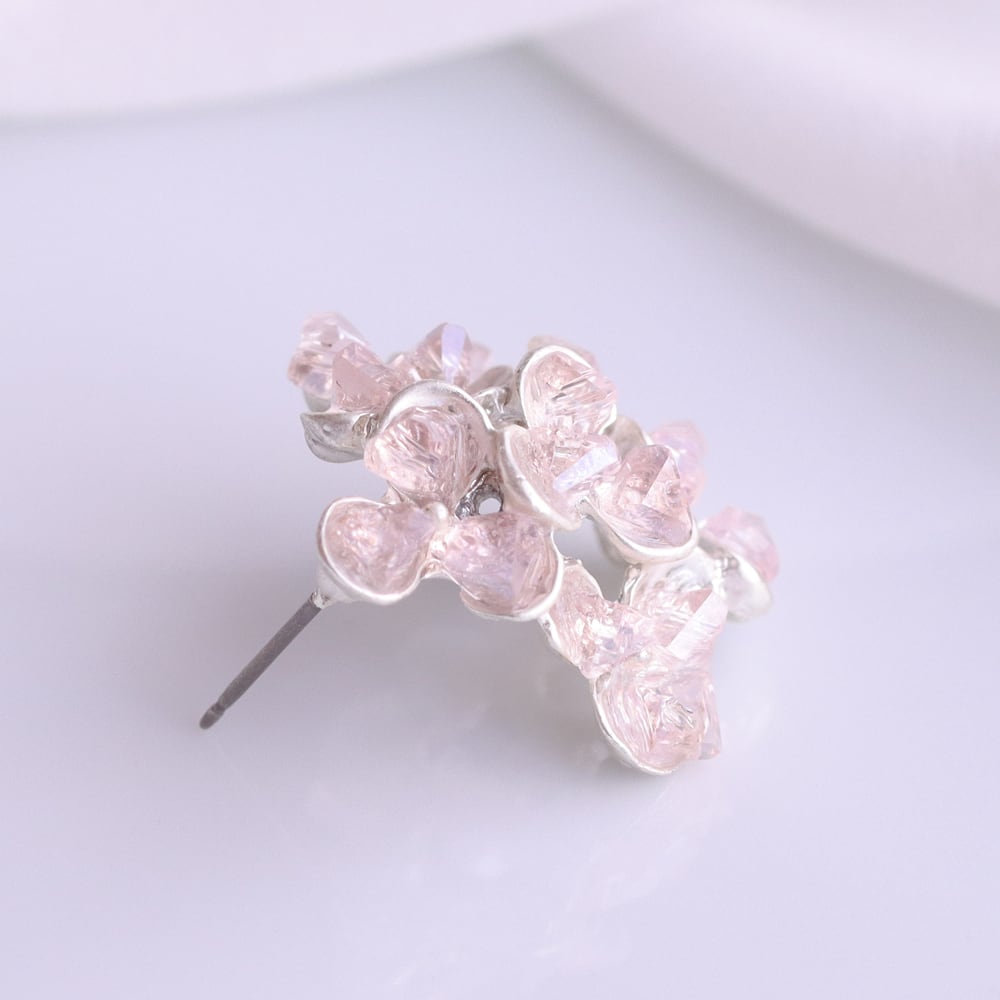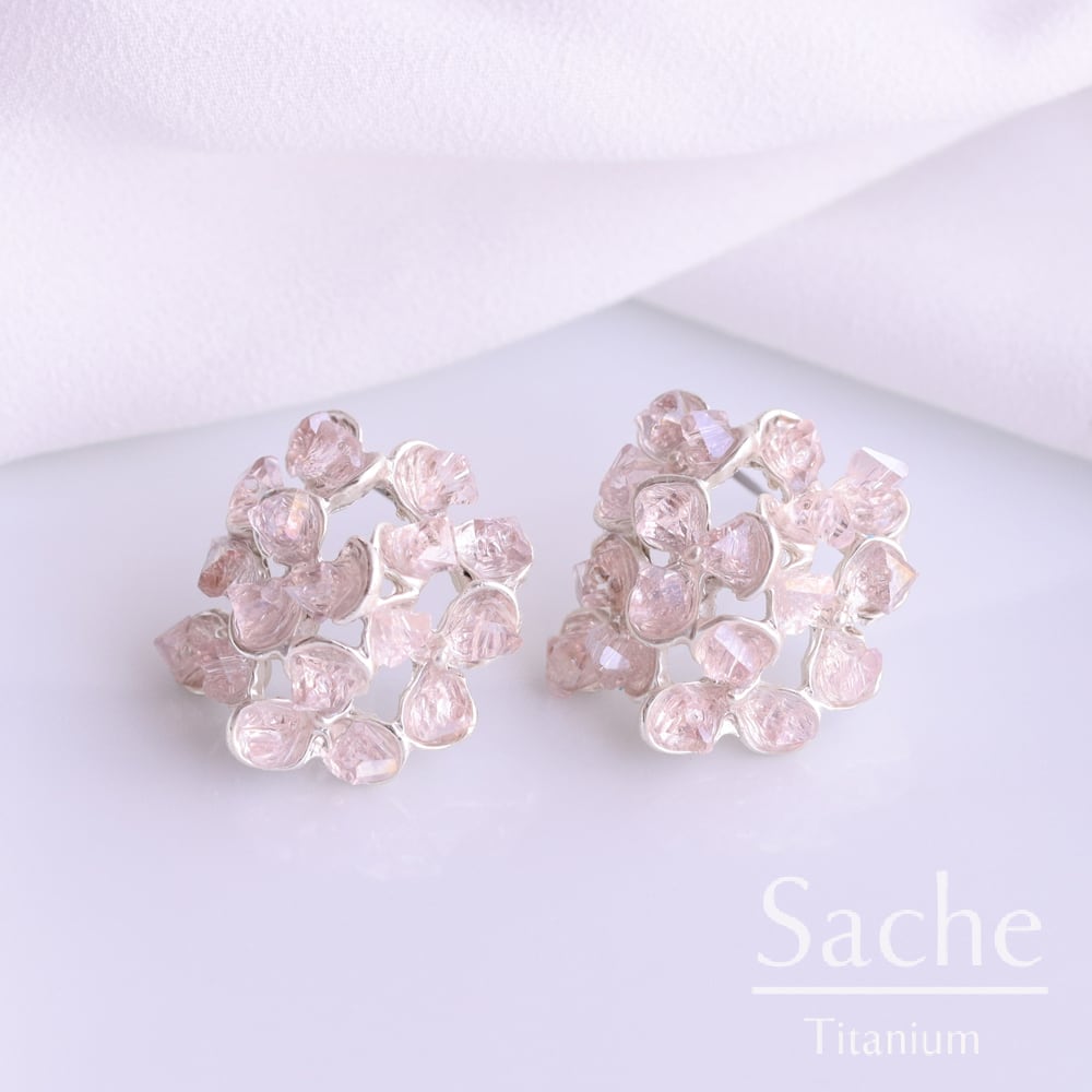 淡いピンクのストーンをこんもりと重ね、花びらに霞がかかる瞬間のような柔らかな表情をかたちにしたピアス「花霞(はなかすみ)」。不定形カットが光を受けて控えめにきらめき、耳元に品のある華やぎを添えます。