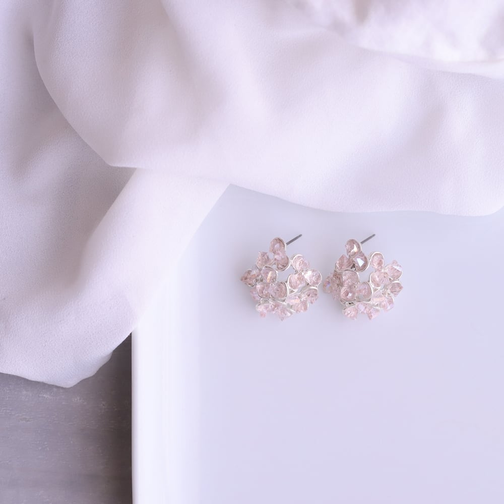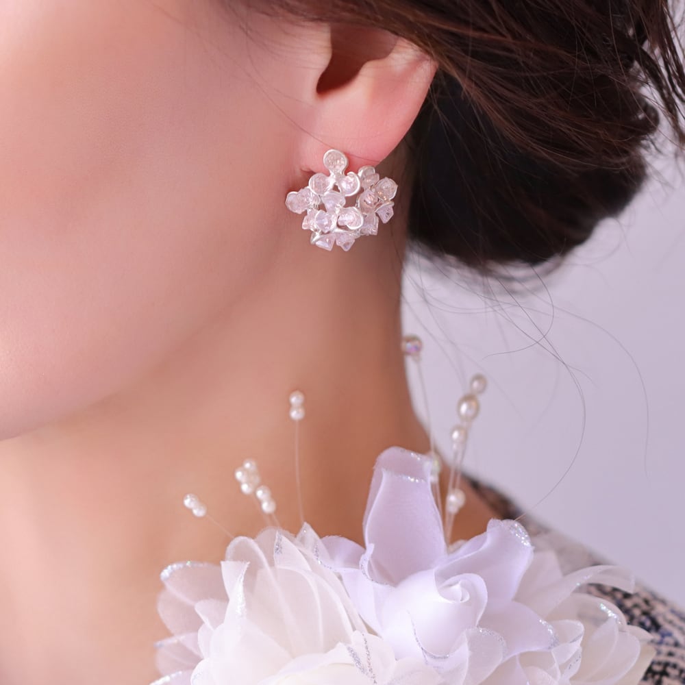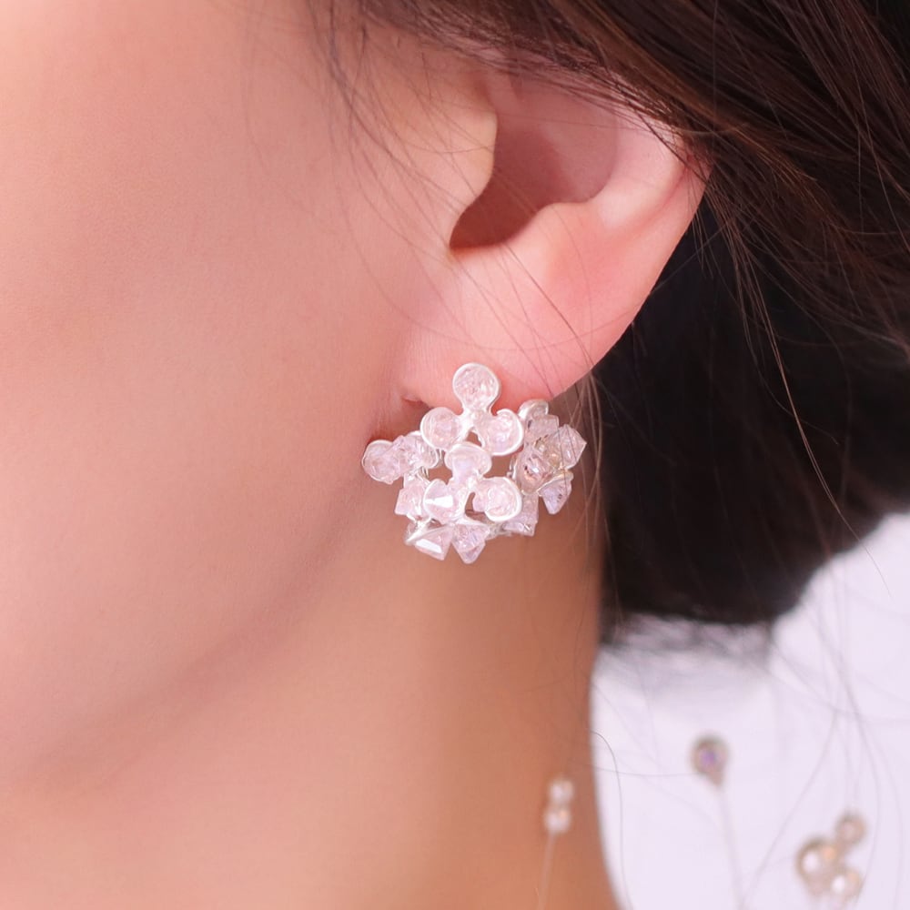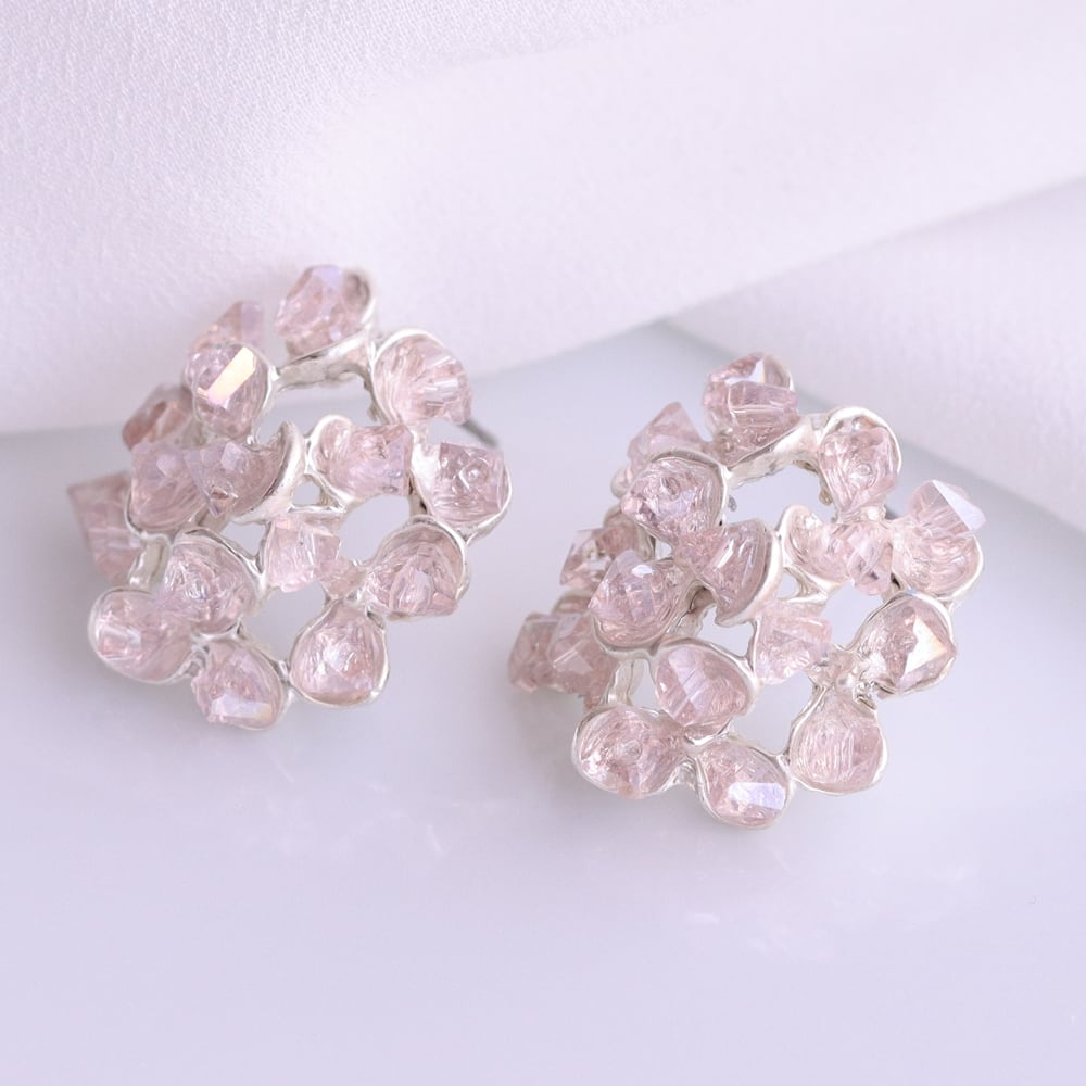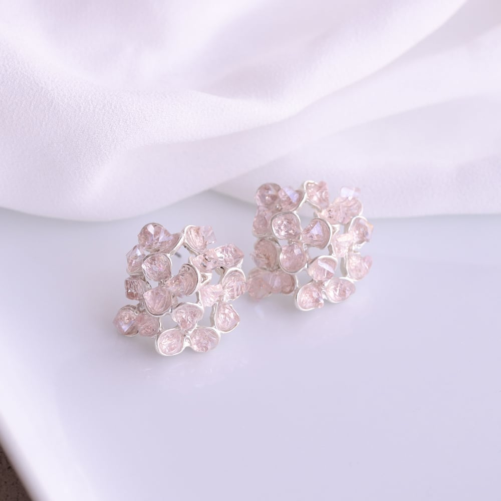 淡いピンクのストーンをこんもりと重ね、花びらに霞がかかる瞬間のような柔らかな表情をかたちにしたピアス「花霞(はなかすみ)」。不定形カットが光を受けて控えめにきらめき、耳元に品のある華やぎを添えます。