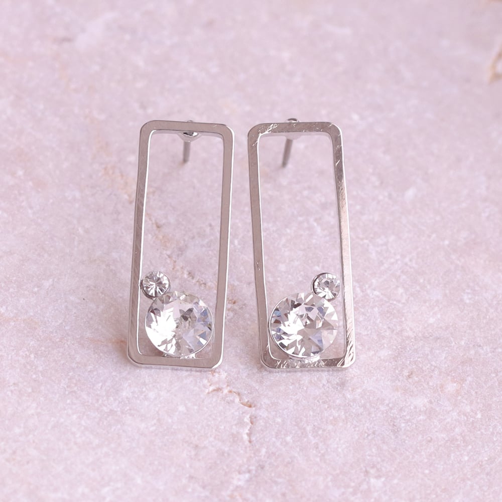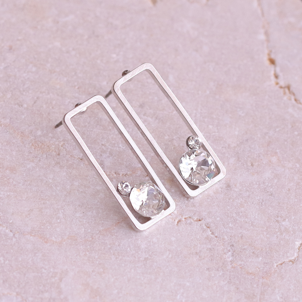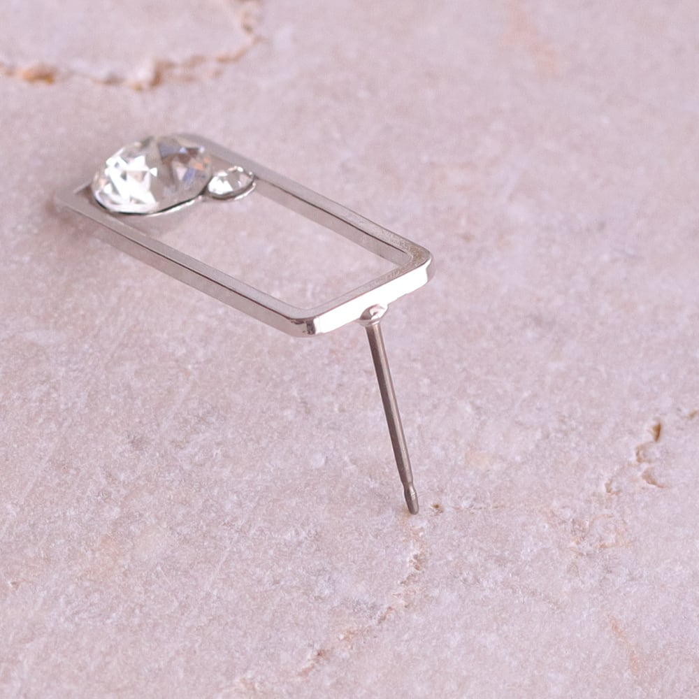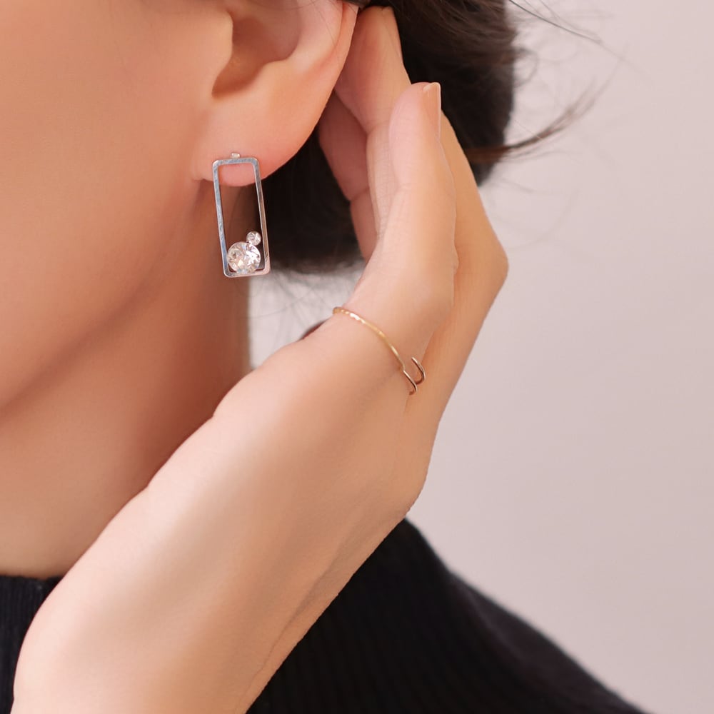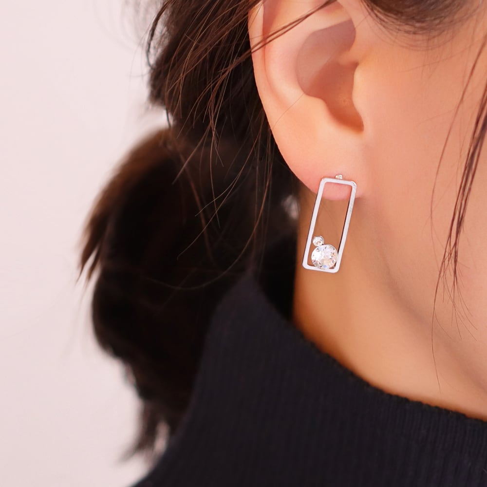 すっきりとした直線で描かれたスクエアフレームが、耳元に凛とした印象を添えるデザイン。余白を活かした軽やかなフォルムが、シンプルながらも洗練された存在感を生み出します。フレームの内側にはクリスタルをさりげなく配置し、動くたびにほのかな輝きをプラス。
