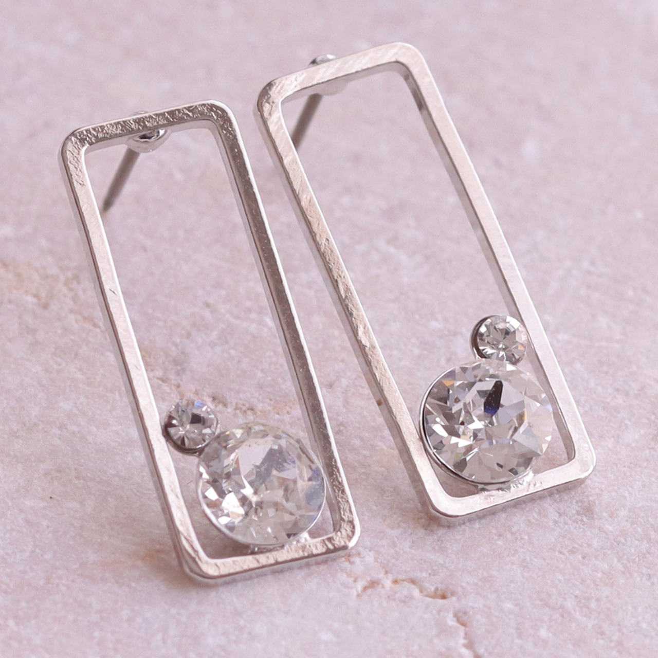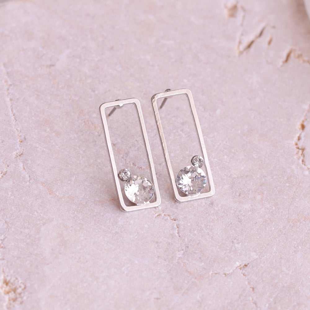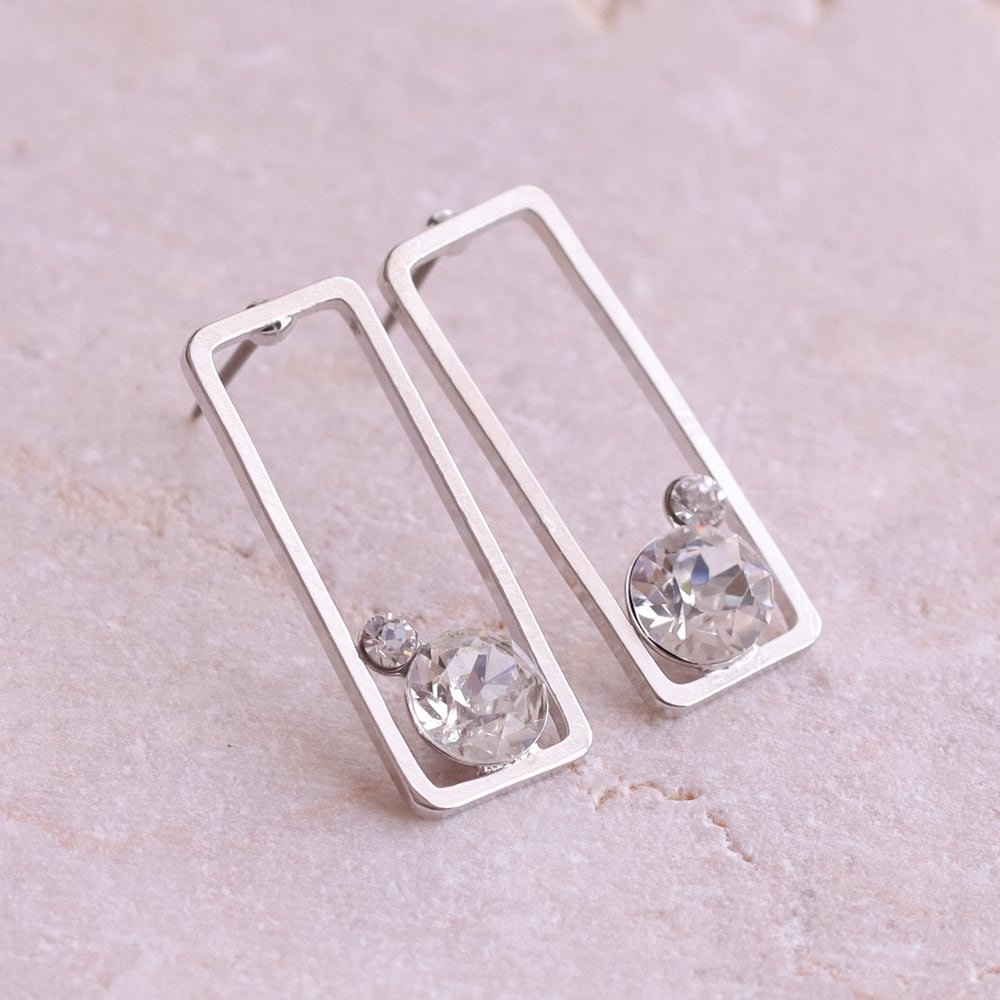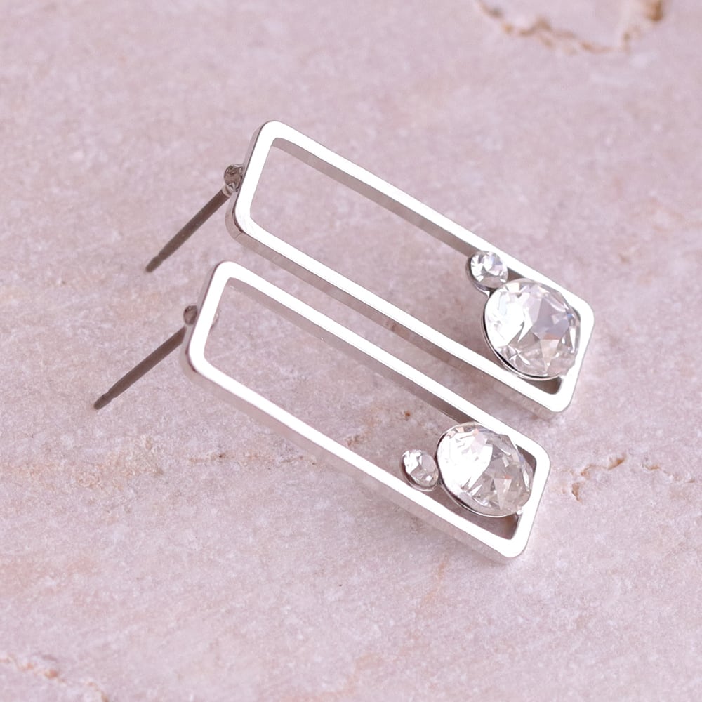 すっきりとした直線で描かれたスクエアフレームが、耳元に凛とした印象を添えるデザイン。余白を活かした軽やかなフォルムが、シンプルながらも洗練された存在感を生み出します。フレームの内側にはクリスタルをさりげなく配置し、動くたびにほのかな輝きをプラス。