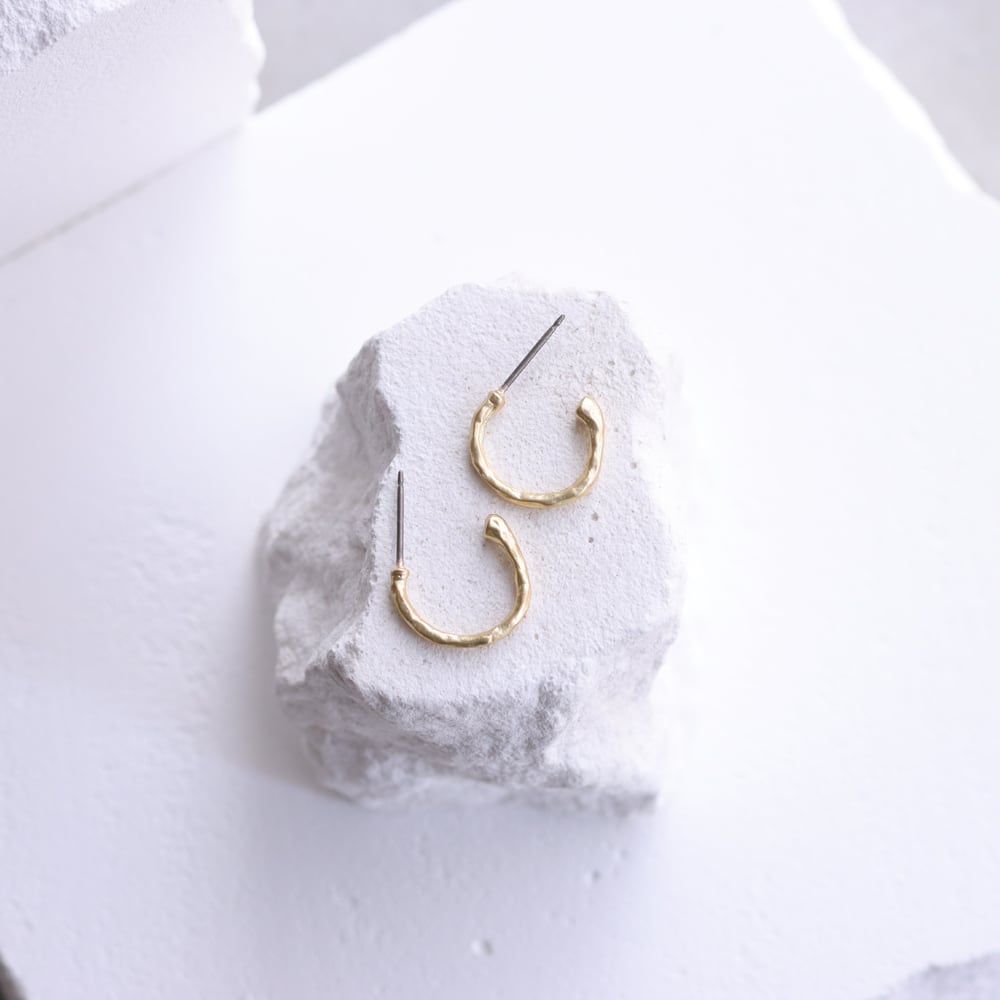 艶を抑えたマットゴールドが、やわらかな光をまといながら耳元に落ち着いた華やぎを添えます。均一ではない、いびつでゆがみのあるフォルムは、手仕事ならではの温もりを感じさせるもの。整いすぎない輪郭がさりげない個性となり、装いに奥行きと洗練をもたらします。