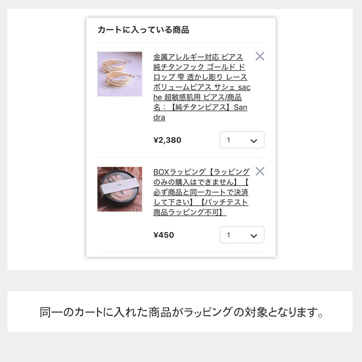 当店のラッピングは「カート内の商品全体をまとめてラッピング」する仕組みです。