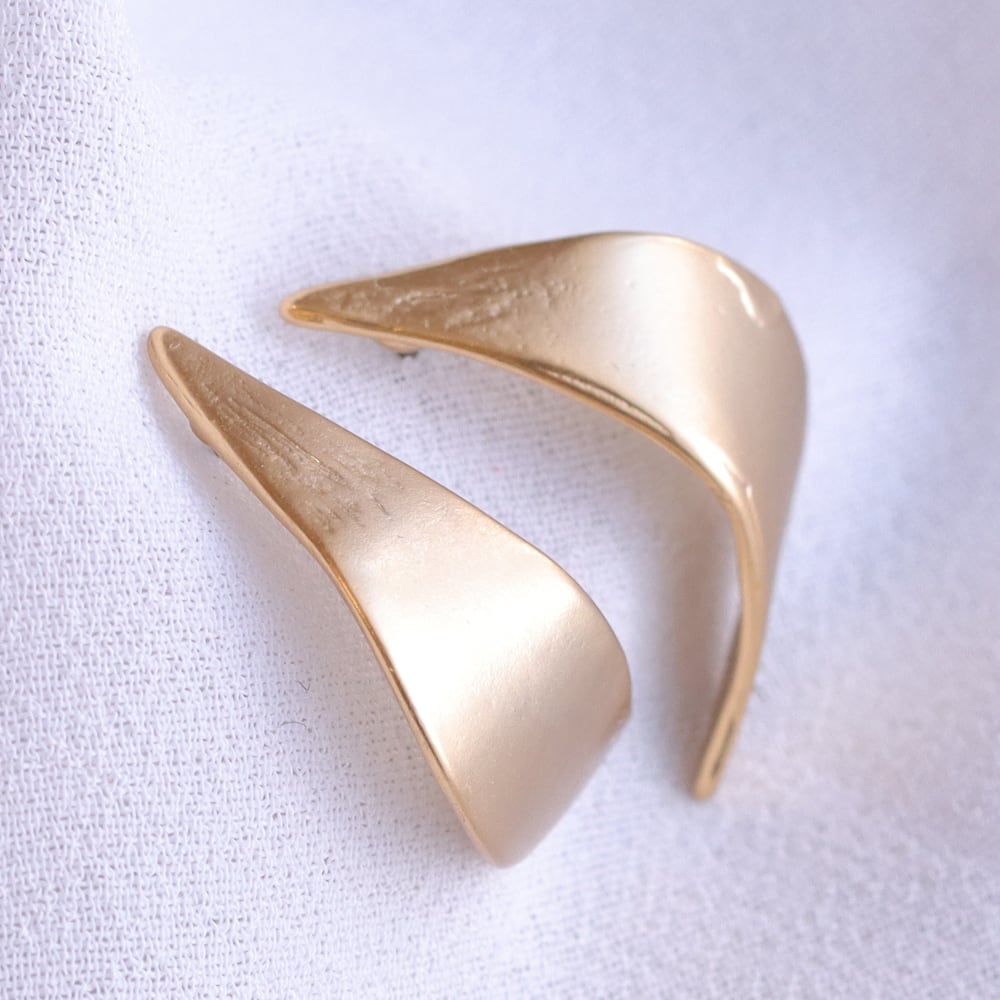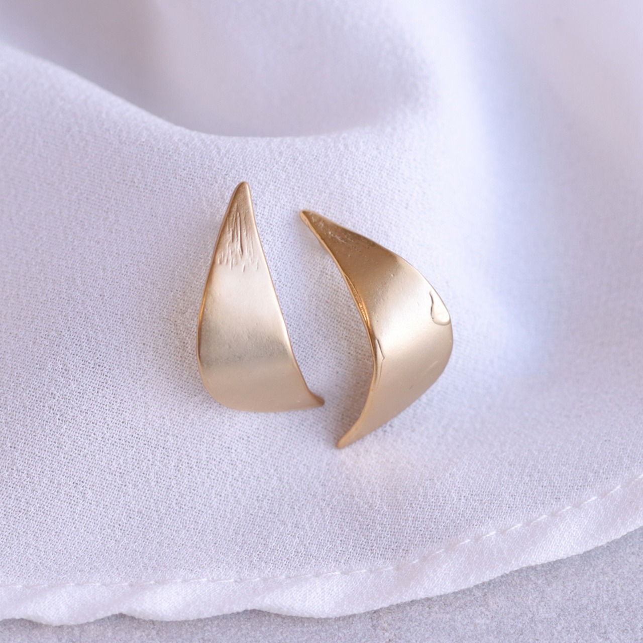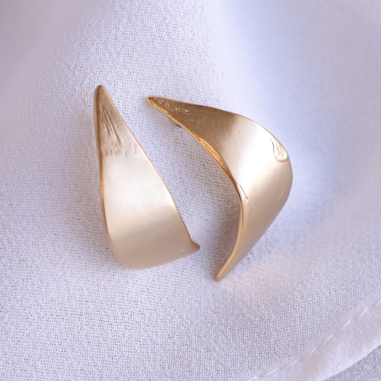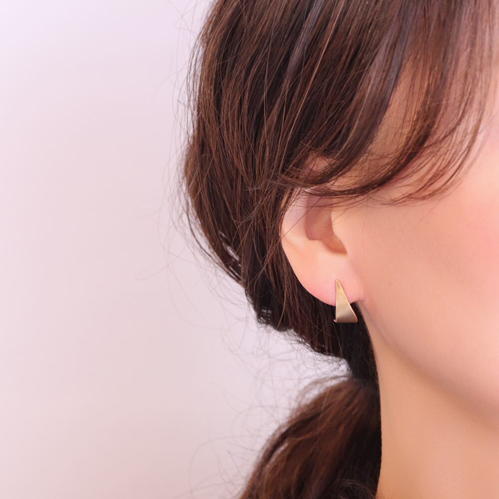 光をふんわり受け止める、マットゴールドピアス「Selma(セルマ)」。リーフのようなメタルが描くなめらかな曲線が、耳元にさりげない品を添えます。