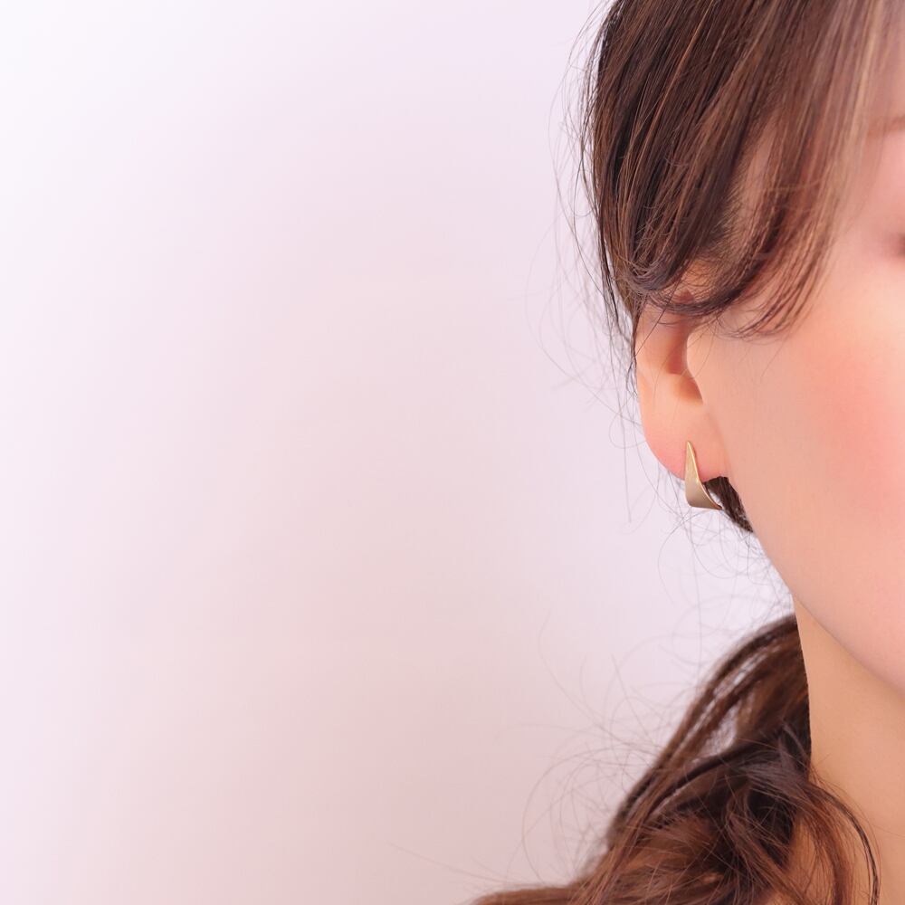 メタルがくるりと立体的にカーブし、耳たぶのラインに沿ってそっと包み込むようなフォルム。正面はすっきり見せつつ、横から見ると奥行きのある曲線が際立ち、さりげなく存在感を発揮してくれます。